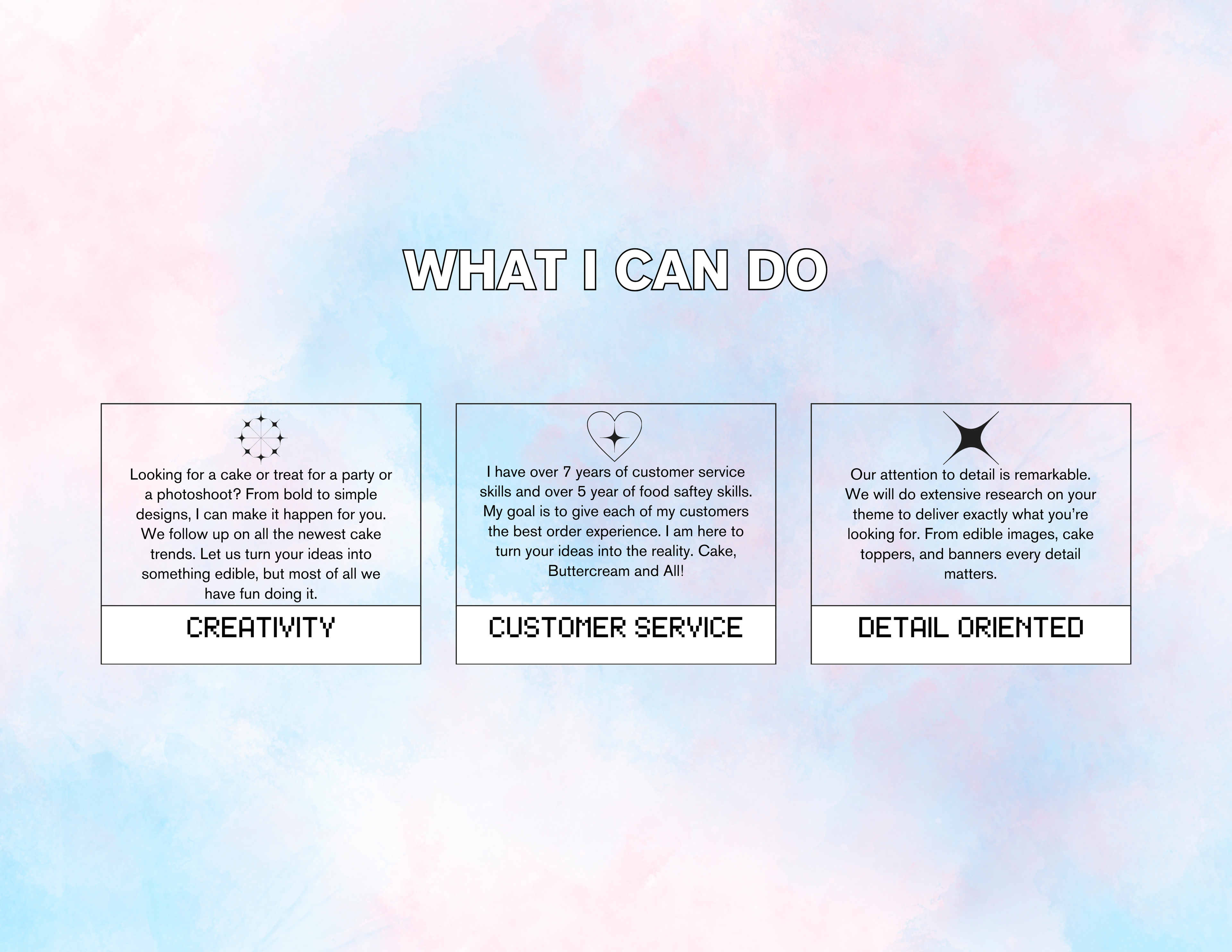 At the moment we only offer Buttercream cakes and cupcakes. We do not do fondant cakes but work with fondant details. We out source our fondant details for all of our orders